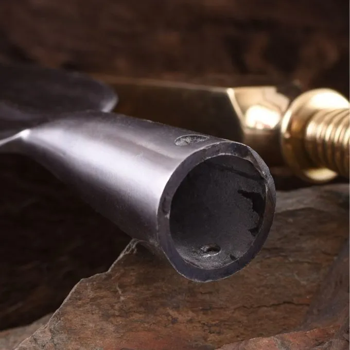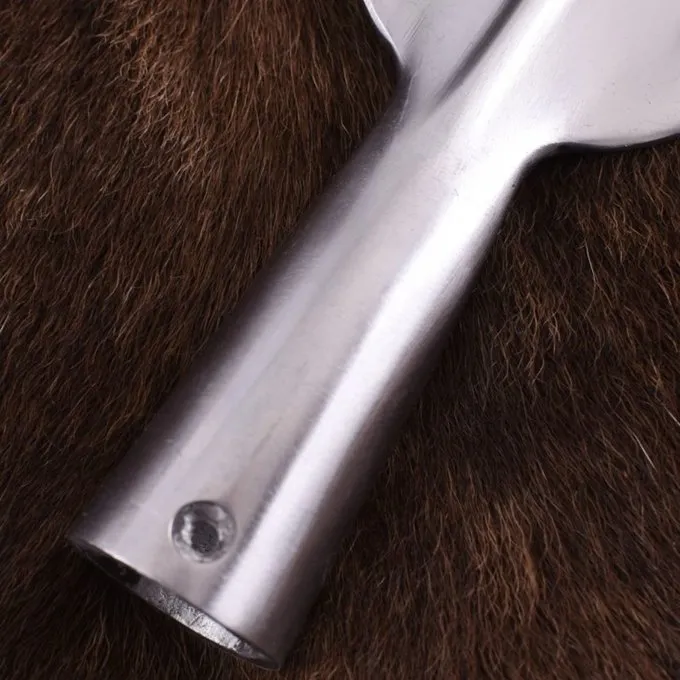 Materiaal: messing (schachtkap), staal (speerpunt) / / Lengte: 28 cm (speer), 27 cm (schachtkap) / / Lengte blad: 22 cm (speer) / / Max breedte: 5,5 cm (spear) / / Lengte punt: 18 cm (schachtkap) / / Binnendiameter sokkel: 2,2 cm (speer en schachtkap) / /