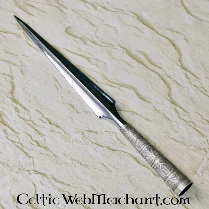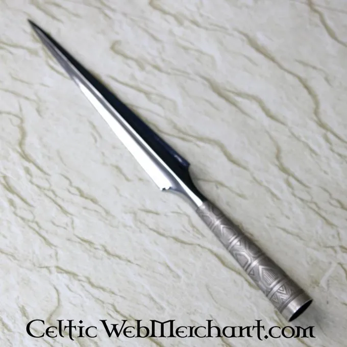 Deze werpspeerpunt is een replica van een Noors origineel. Speerpunten zoals deze werden overal in Vroeg-middeleeuws Europa gebruikt. Deze speerpunt is smal, smalle lange speerpunten werden door de vikingen bij uitstek gebruikt voor werpsperen. De werpspeer was een populair wapen, maar alleen de aristocratie kon zich gedecoreerde punten zoals deze veroorloven.