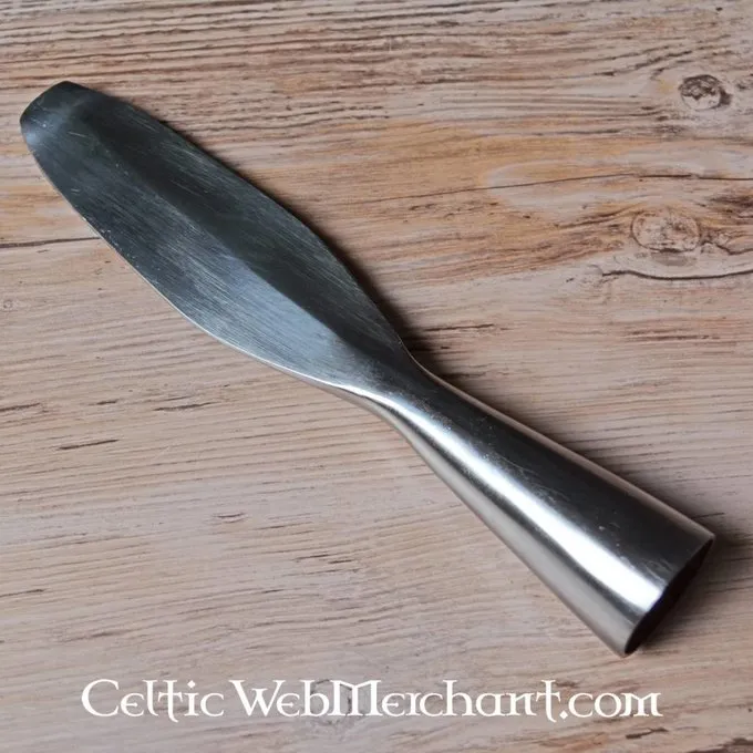 Productdetails: Lengte: 20 cm / Bladmaat: 12.5 cm / Ringdiameter: 2.8 cm / Materiaal: En45 verenstaal hardheid 48-50 HRC. / Snede: Bot (battle-ready) / Veiligheidsdop: ja / Inclusief schacht: Nee / Gebaseerd op een historisch origineel: Ja /