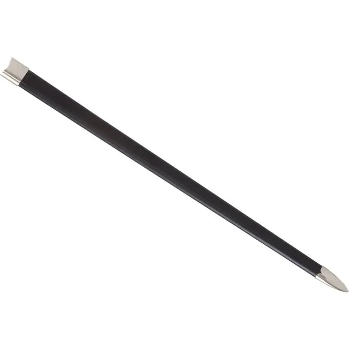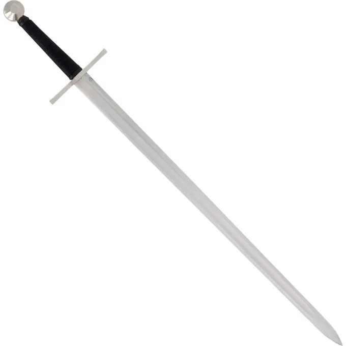 Dit zwaard is gemaakt van een hoge kwaliteit verenstaal met een hardheid van 50-55° Rockwell. Hij heeft een zwarte leren grip en een scherpe kling en punt. Hij wordt geleverd inclusief een zwarte schede met stalen beslag.