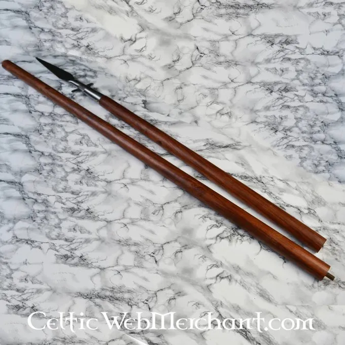 Deze Vikingspeer is 220 cm lang en heeft een speerpunt van 40 cm lang. De houten steel is in het midden geschroefd.