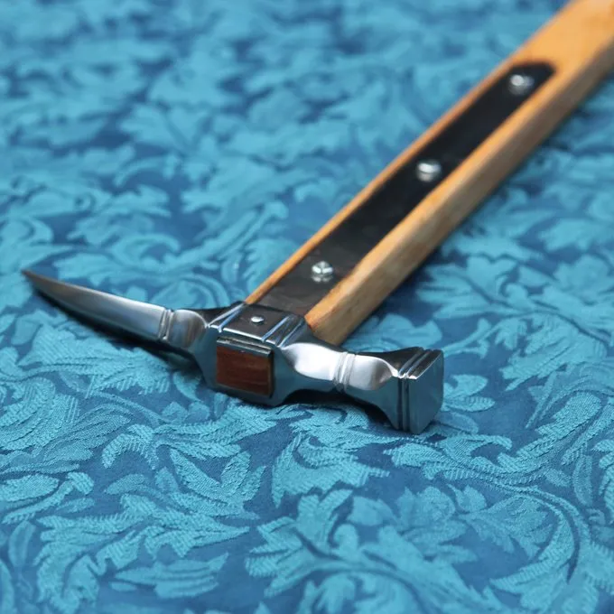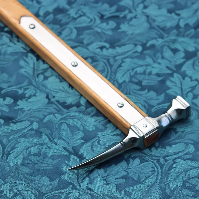 Materiaal: 1065 koolstofstaal, leer, hout / Punt: tussen semi-scherp en bot. Gemakkelijk zelf af te botten voor gebruik bij reenactment / Lengte: 63,2 cm / Lengte hamerkop: 16 cm / Lengte grip: 23,3 cm / Balanspunt: 21 cm onder het hamerblad / Gewicht: 74